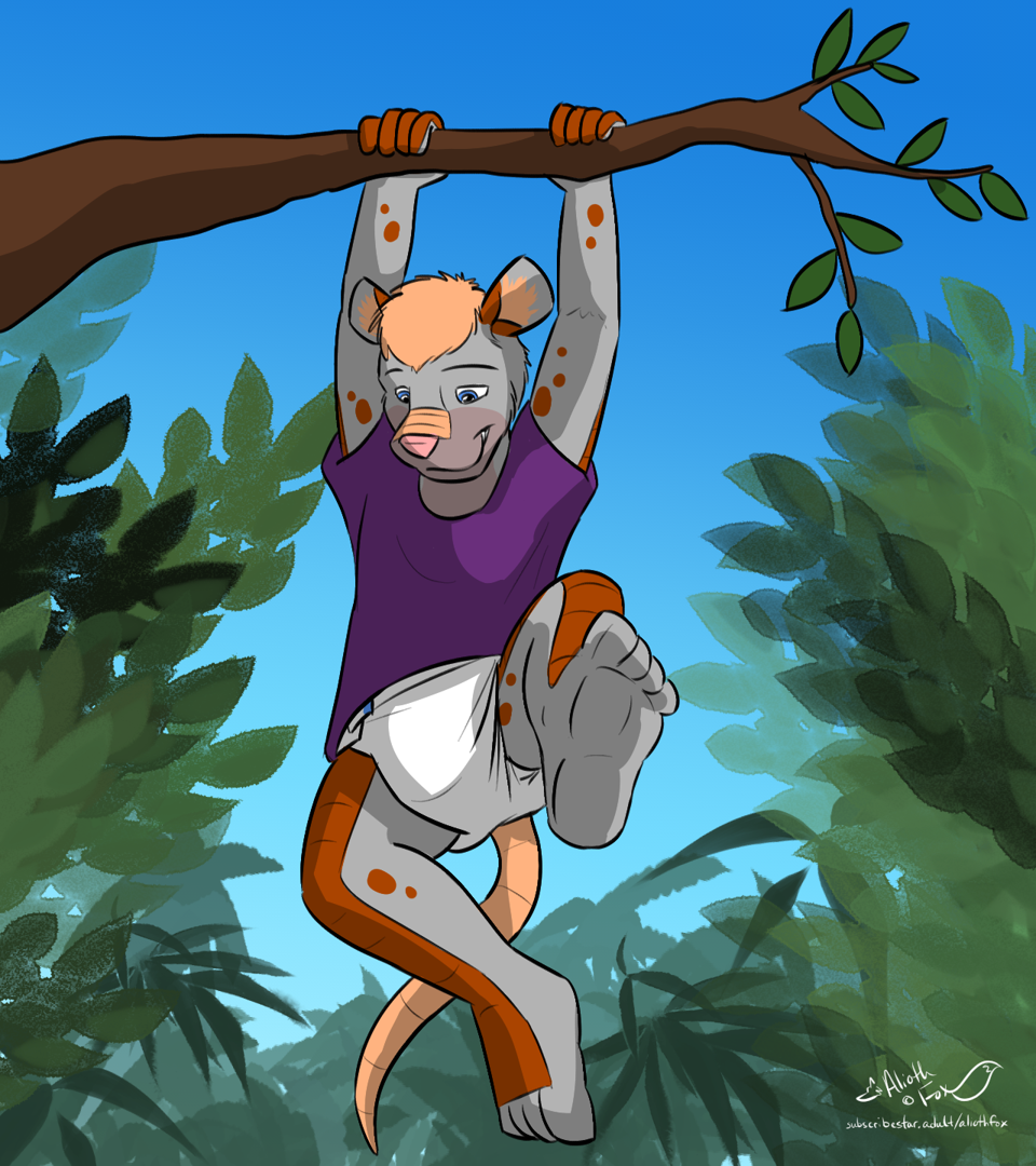 An anthropomorphic armadillo swinging from a branch